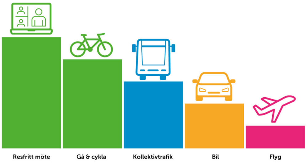 Vid behov av möte tar vi hänsyn till vilka som behöver närvara och om mötet ska ske digitalt eller fysiskt. Om deltagare reser till mötet så anpassas mötestiden till kollektivtrafiken. För att resan ska bli så hållbar som möjligt ska vi välja det färdsätt som främjar hälsan och är mest klimat- och kostnadseffektivt.